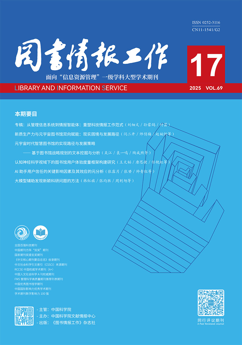 [目的/意义] 认知神经科学方法的应用使得从神经生理层面对图书馆用户体验进行客观度量成为可能,通过系统梳理相关领域研究成果,基于认知神经科学方法构建图书馆用户体验度量框架,为图书馆用户体验的客观、精准度量提供参考借鉴。[方法/过程] 以Web of Science和中国知网为数据源检索,依据标准筛选出53篇应用认知神经科学方法进行图书馆用户体验度量的文献,结合层次体验理论,在梳理分析相关文献的基础上,融入认知神经科学方法,构建图书馆用户体验的VBR三层度量框架模型。[结果/结论] 图书馆用户体验可解构为本能层面的感官体验、行为层面的交互体验和反思层面的情感体验,借助脑电图、事件相关电位、心电图、眼动等认知神经科学工具进行多通道感官捕捉、跨区域认知定位和全方位情绪探测,能够精准量化图书馆用户体验在各层级的表现水平,并厘清其背后复杂的神经机制与心理动因。